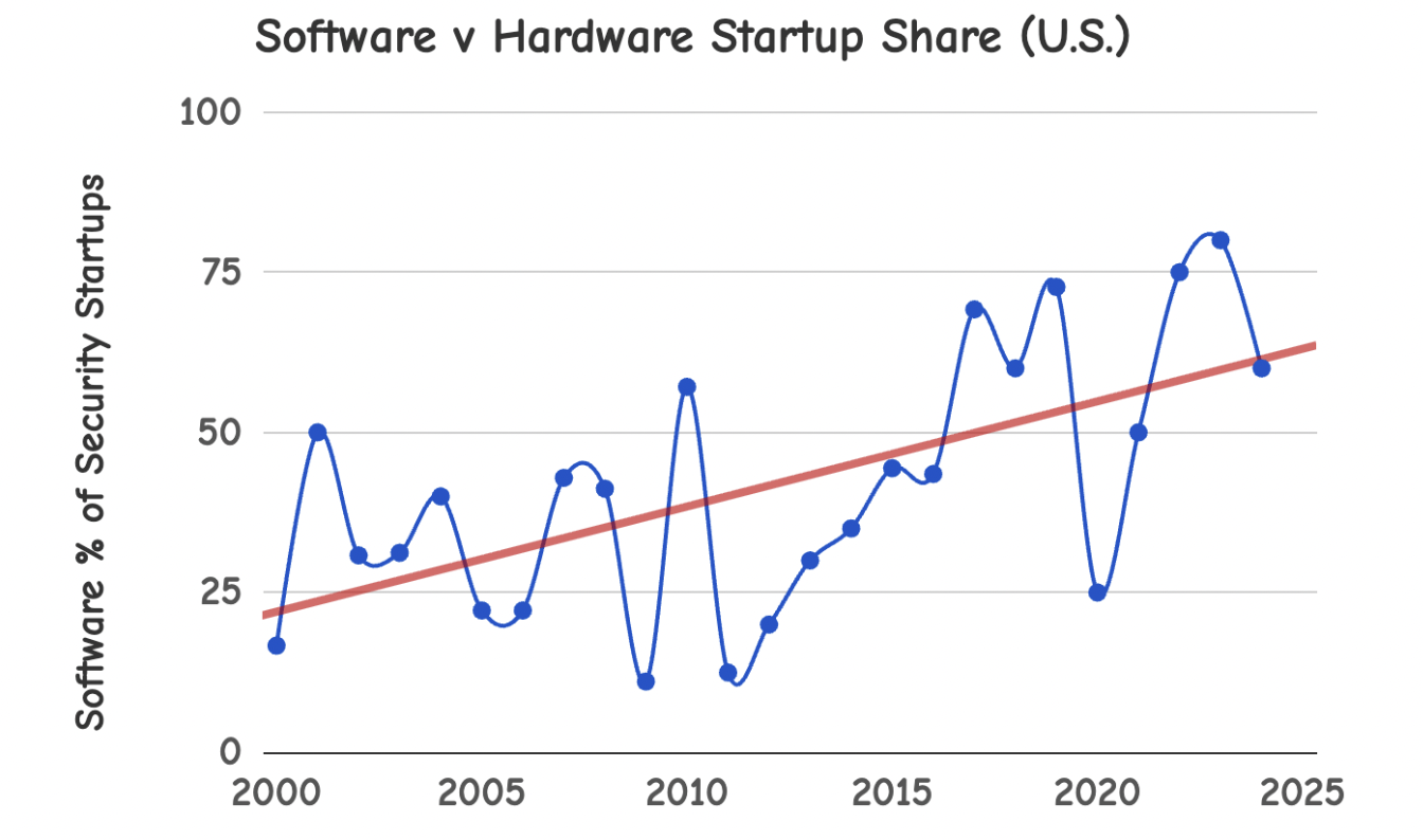 The increasing ratio of software to hardware startups (not even counting cyber) tells a familiar story to anyone who has lived through this period in the physical security industry. Well into the early 2000s, hardware led the majority of new company launches (cameras, devices, biometrics), with software accounting for only a quarter of new entrants. By 2010, the number of security software companies had increased to nearly half of new startups, aided in part by the IP revolution in camera technology, which enabled more sophisticated VMS platforms than ever before. And today, software startups are clearly in the majority, with AI likely to increase that percentage even further.