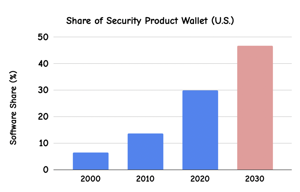 On a global basis, the software share is estimated to have grown from approximately 5% of total security product spend in 2000 to roughly 30% in 2024. Some markets have shown an even more dramatic transformation. The U.S. market—which has traditionally led in cloud and other security technology adoption—has increased from roughly 10% to more than 40%, with further growth anticipated between now and 2030.